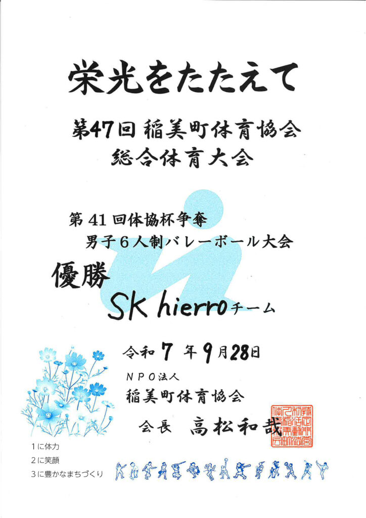 第47回稲美町体育協会総合体育大会 第41回体協杯争奪 男子6人制バレーボール大会において、見事優勝いたしました。